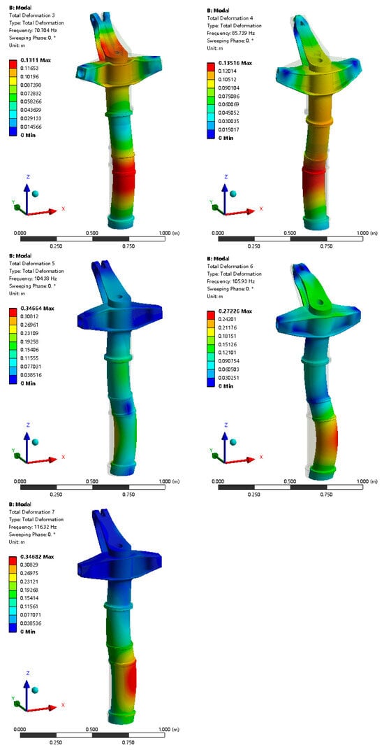 The cumulative effective mass fraction is calculated as the sum of the equivalent mass from the first mode to the respective mode divided by the total equivalent mass. A higher value indicates that a greater portion of the excitation force is distributed among the various modal shapes, meaning that the analysis results more accurately reflect the actual vibration situation. The cumulative effective mass fraction in the X-direction exceeds 0.85 after the seventh mode; for the Y- and Z-directions, this occurs after the fifth and fourth mode, respectively. Therefore, analyzing the first seven modes satisfies the requirements for analyzing the vibration characteristics of the landing gear. The first seven modal shapes are shown in Figure 6.