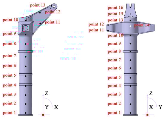 Modal testing was conducted using a Single Input Multiple Output (SIMO) approach. Accelerometers were positioned at intervals of 100 mm along both the nose and side surfaces of the landing gear, perpendicular to the ground direction. Because the landing gear was installed on an aircraft and multiple points on the structural surface were not conducive to sensor placement, slight adjustments were made to the positions of these points where necessary. The resulting sensor placement diagrams for both directions are shown in Figure 7.