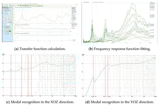 As illustrated in Figure 10a,b, the data from the two directions were imported into the modal analysis software Data Acquisition & Signal Processing V11 (DASP V11) using the Fast Fourier Transform (FFT) method. The output frequency response functions facilitated the generation of modal identification state diagrams for both directions. The modal identification state diagrams were obtained directly by employing the Eigensystem Realization Algorithm (ERA) included in the software. Figure 10c,d were thus produced. By integrating the modal stability corresponding to each frequency, the first four modes and the first three modes were, respectively, selected for the two directions.