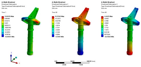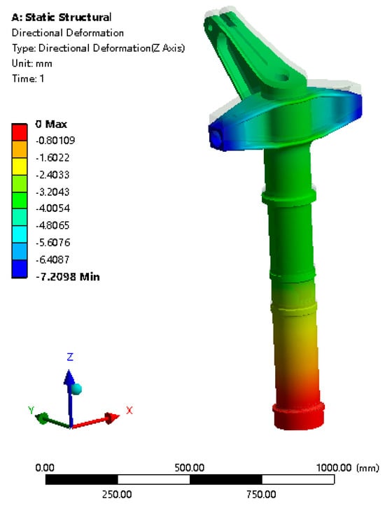 Under empty and fully loaded conditions, there are significant differences in the vertical forces on the nose landing gear, with the maximum force occurring during the 54 km/h fully loaded taxiing process. To further investigate the mechanical performance of the structure, ANSYS Workbench was used to analyze the deformations of the landing gear under each condition, as shown in Figure 17.