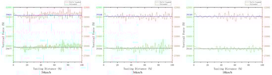 The towing operations of the aircraft towing taxi-out system are categorized into three speeds: high (greater than 25.93 km/h), medium (11.11–25.93 km/h), and low (less than 11.11 km/h). Using the same 2 km long Grade A runway, simulations were conducted for medium- and high-speed taxiing at towing speeds of 54 km/h and 36 km/h, respectively. These simulations were performed under both empty and fully loaded aircraft conditions, with aircraft masses of 44,330 kg and 78,100 kg, respectively. The vertical forces on the nose landing gear were obtained as a function of the aircraft taxiing distance, as shown in Figure 16.