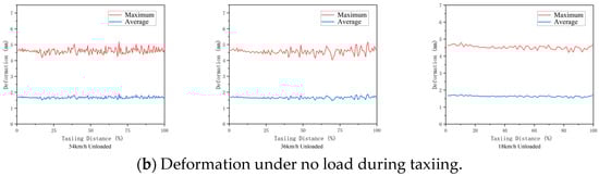 3. Relationship Between Force and Deformation: During medium- and high-speed towing taxi-out, a greater towing speed results in a greater average vertical force on the landing gear. Similarly, a greater aircraft weight produces a greater average vertical force on the landing gear. The maximum force and deformation of the landing gear occurred under towing at 54 km/h, with the maximum deformation being 8.284 mm and the average deformation being 2.897 mm.