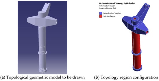 In the geometric modeling software CATIA P3 V5-6R2019, without affecting the setting of boundary conditions, the space is filled according to the geometric model of the outer cylinder of the landing gear’s vibration-damping strut, resulting in the geometric model ready for topology as shown in Figure 19a. In ANSYS Workbench, finite element analysis settings corresponding to the towing taxi-out mode are added to the model awaiting topology, and the topology optimization region is selected, as shown in Figure 19b.