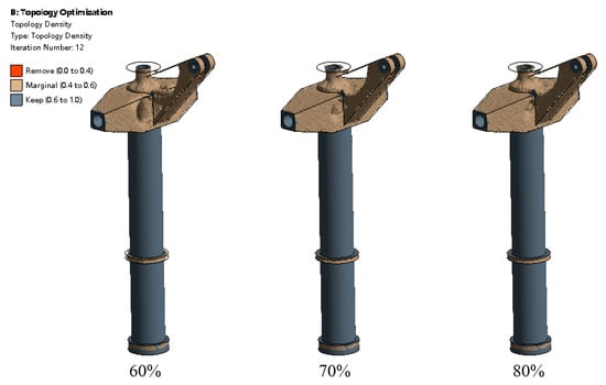 The topology was conducted with the optimization objectives of retaining 60%, 70%, and 80% of the mass of the model awaiting topology, resulting in the outcomes shown in Figure 20 and Figure 21.