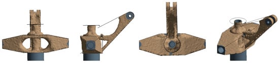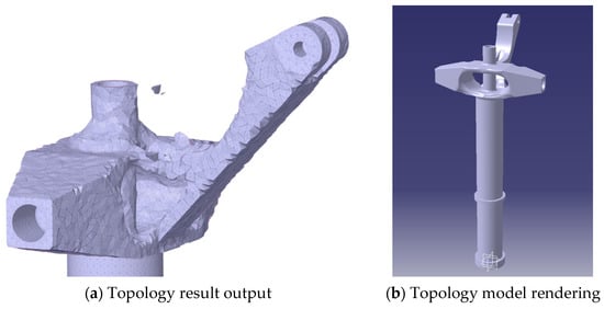 The topology results reveal that in response to the optimization of the upper segment of the outer cylinder and the lower resistance arm of the vibration-damping strut, the optimization characteristics include preserving the shape of the upper segment’s tubing and optimizing the connection between the lower resistance arm and the upper segment of the vibration-damping strut’s outer cylinder. As shown in Figure 22, for the topology model that retains 75% of the mass, exporting and performing surface repairs and other geometric clean-up operations are conducted. In the geometric modeling software, a model suitable for a finite element analysis is reconstructed.