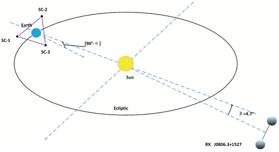In this section, we present an analysis of the dynamics for DFAC systems, problems we focused on are formulated, and the background for the TianQin mission is shown in Figure 1. A formation of three geocentric orbit satellites was considered, where denotes the angle between the spacecraft formation plane and the ecliptic plane, while represents the angle between the detection source RX J0806.3+1527 (a binary white dwarf system) and the ecliptic plane, which remains stable at approximately . The orbital plane of the spacecraft directly faces the detection source, implying that the line connecting the geocenter and the detection source forms a degree angle with respect to the ecliptic plane.