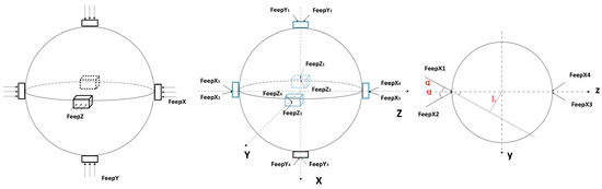 In this study, we considered SC as a spherical object. For convenience, we designate the field emission electric propulsion (FEEP) as , where and . Specifically, represents the layout in the YOZ plane, denotes the layout in the XOZ plane, and signifies the layout in the XOY plane. The micro-thrust system comprises a total of 12 thrusters. It was assumed that each thruster is located at a distance of L from the center O. Furthermore, every pair of thrusters exhibits symmetry about their corresponding axis with an angle difference of . Figure 4 illustrates a schematic diagram depicting this arrangement.