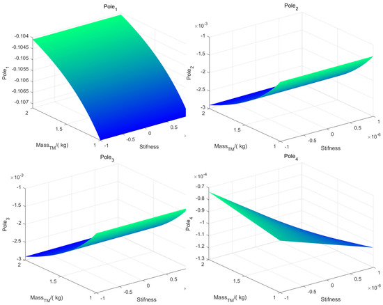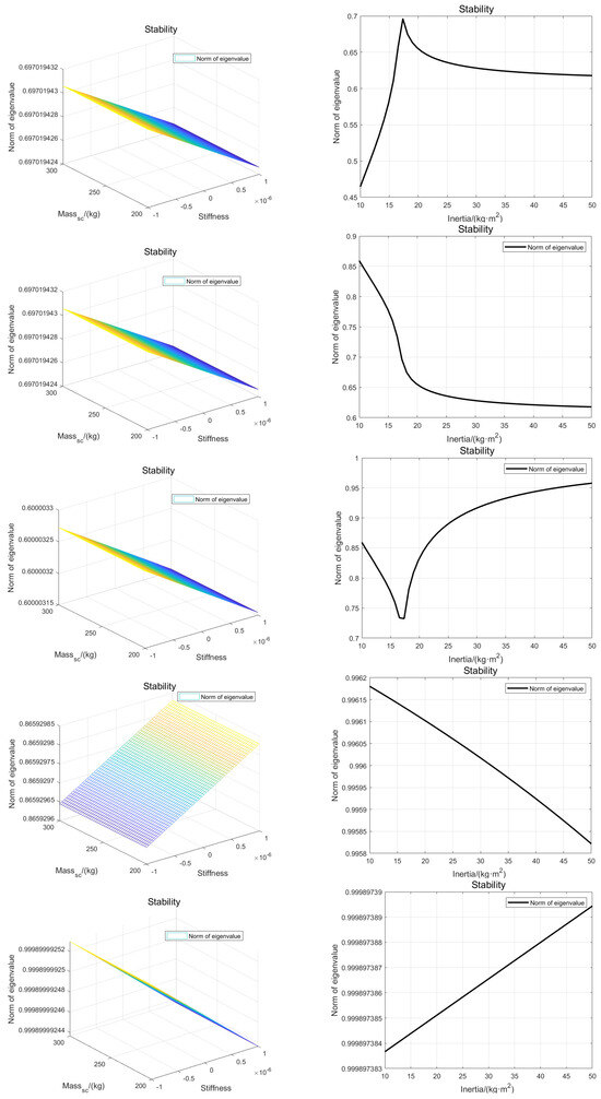 The stability of the control system is analyzed in each loop [41]. In this paper, stability is placed in the discussion with the uncertainty of parameters in (40), including (the mass of the spacecraft), (the mass of the test mass), (the moment of inertia of the spacecraft), and (the corresponding main diagonal elements of the stiffness matrix):