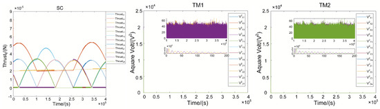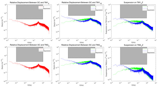 Frequency performance of the control strategy in this study is shown in Figure 10, including the PSD results of the offsets of TM1 and TM2 along all of the axes and PSD results of the control signal on test masses, which was limited by the requirements in Table 1, and the outputs of the micro-thrust system for the satellite and square of the voltage of the actuator on TM1 and TM2 are shown in Figure 11.