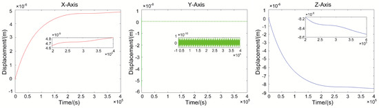The norms of the eigenvalues for the drag-free loop and spacecraft attitude loop is depicted in Figure 8, with the norms of eigenvalues for the drag-free loop presented on the left, while the norms of eigenvalues for the spacecraft-attitude loop are provided on the right. As is shown in Figure 8, we calculated the eigenvalue of based on (45); it is obvious that the stability of the drag-free loop was guaranteed with the disturbance of parameters and .