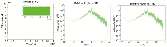 The attitude controllers for the satellite and test masses were designed without mechanisms that rotate the load internally; thus, the design for this system provides a reference result for future work, and the result of the attitude control system was evaluated without requirements. We took the Y-axis as the example, where the attitude of the satellite and relative angle between the satellite and test masses are shown in Figure 13.