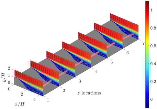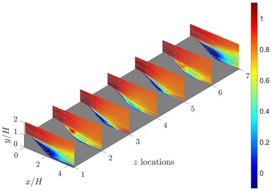 To investigate the flow separation characteristics in the baseline flow, a series of 2D PIV measurements are conducted in this study. Figure 3 offers a comprehensive three-dimensional portrayal of the velocity fields captured at seven equally spaced spanwise locations. These measurement planes are aligned with the positions of the pressure taps in the experimental setup, with a spacing of H between consecutive streamwise measurement planes. In addition to presenting velocity contours, 2D streamlines are superimposed on each measurement plane to visualize flow separation and recirculation phenomena. Notable similarities are evident across these planar velocity profiles, including the expansion of shear layers and the occurrence of flow recirculation. To capture the vortex core within the recirculation region, a vortex identification method proposed by Graftieaux et al. [56] is employed to extract the core locations on all measurement planes. These core locations are then connected by a red thick tube in the figure. The distribution of vortex cores exhibits strong symmetry about , with the locations of vortex cores shifting further downstream as the measurement planes approach the side walls.