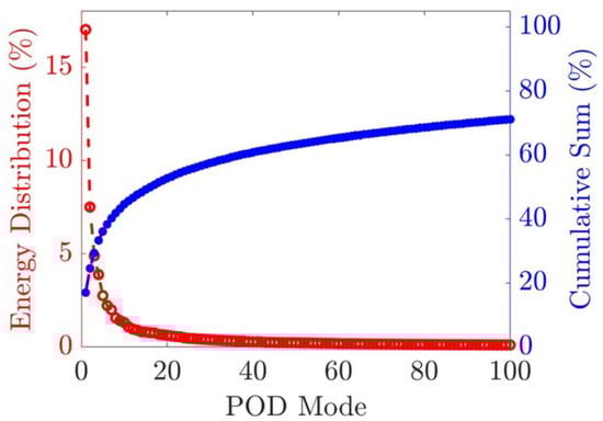 Here, m denotes the m-th POD mode, and M represents the truncation of the leading POD modes. The contribution of the first 100 POD modes to the turbulent kinetic energy, as well as the cumulative sum, are presented in Figure 4. Notably, the first POD mode captures approximately 17% of the turbulent kinetic energy (TKE), while the second and third POD modes contribute only 7.5% and 5% of the TKE, respectively. Similar observations are reported in prior studies such as Kourta and Gilliéron [9] for a straight ramp profile and Thacker et al. [59] for the rear slant of an Ahmed body.