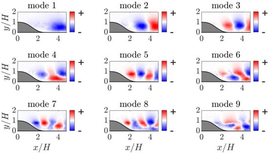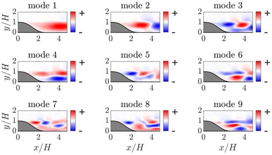Figure 5 and Figure 6 illustrate the streamwise and wall-normal components of the first nine POD modes. The first POD mode captures large-scale fluctuations inside the recirculation region, as extensively discussed in Kourta et al. [39]. In their work, they demonstrated that a low-order reconstruction combining the mean velocity and the first POD mode reveals the flapping motion of the recirculation region. Modes 2 and 3 depict a pair of wave-like turbulent structures in the flow, representing turbulence convection at two orthogonal phases. These modes exhibit the largest-scale turbulent structures primarily residing within the shear layer. Higher-order modes also feature alternating positive/negative structures within the shear layer, albeit with smaller turbulent structures. These turbulent mechanisms, including the vertical flapping motion of the recirculation region and the downstream convection of large-scale coherent structures inside the separated shear layer, align closely with discussions in previous studies such as Cherry et al. [60], Kiya and Sasaki [61], Largeau and Moriniere [62].