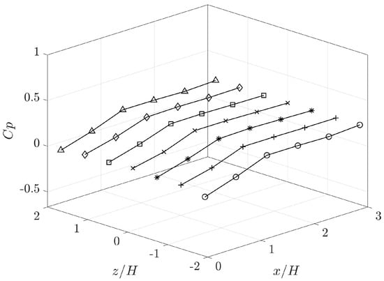 The pressure coefficient () profiles on the uniformly distributed pressure taps on the ramp surface are depicted in Figure 7. Notably, there are strong similarities observed in the pressure profiles across all measured spanwise locations. Near the ramp leading edge, the pressure coefficients remain close to 0 across all spanwise positions. Moving downstream of the ramp, the pressure gradually increases, reaching its maximum value () between and . With the implementation of hybrid passive and active actuators aimed at reducing pressure separation on the ramp, further enhancement of the downstream surface pressure is anticipated.