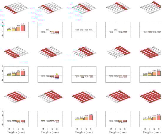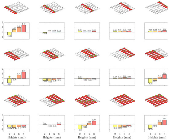 The parametric results of different purely passive control laws from the actuator matrix. The activated hybrid actuators are denoted in red. For each arrangement, flow control outcome at 4 different actuator heights are evaluated. The best flow control result is denoted by a yellow star in the figure.