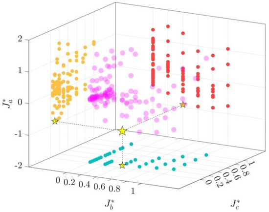 Three-dimensional visualization of the relationship between the cost function , equivalent duty cycle , and the equivalent actuator height from the parametric study. The location of the best-performed case is denoted by a yellow star. Different colors represent the projection of data onto different two-dimensional planes.