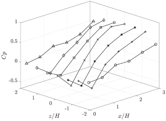 Flow measurements are conducted to enhance our understanding of the flow control outcomes, focusing on the optimal parametric case identified in Figure 9, where the first two rows are activated at a height of 2 . Figure 11 displays the pressure coefficient profiles () measured on the ramp surface under the best-controlled case. Close to the leading edge of the ramp, exhibits a gradual decrease towards the ramp surface, indicative of a favorable pressure gradient induced by active blowing. Subsequently, a sudden pressure drop occurs, followed by a steady recovery of pressure along the streamwise direction. Notably, at , the pressure coefficient reaches approximately at , while registering about across all other spanwise locations. The slightly lower pressure recovery observed on the sidewalls is attributed to the absence of corresponding actuators in those regions.