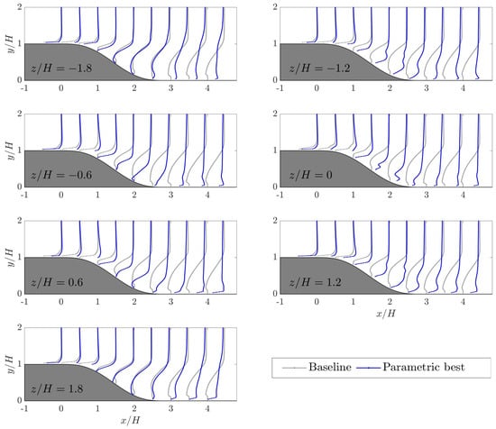 Comparison of streamwise velocity profiles at different spanwise locations under the baseline and the best parametric cases.