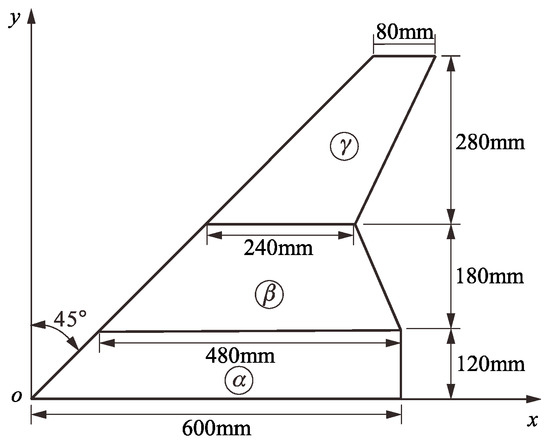 The coordinates of the structural grid points and aerodynamic control points of the inner wing segment were unchanged with the folding angle of the middle wing segment. However, it is necessary to reconstruct the coordinate values of all structural grid points and aerodynamic control points on the middle and outer wing segments. Assuming that in the unfolded state, the lengths of the middle and outer wing segments along the spanwise direction are and , respectively. Let the coordinate values of the structural grid points (or aerodynamic control points) on the middle wing segment be , and the coordinate values of the points on the outer wing segment be . Then, two coordinate transformation relationships