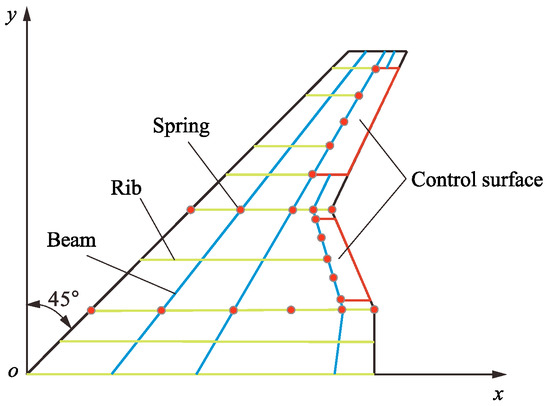 The FEM was introduced to construct a structural model of the modified folding wing under the fully unfolded configuration. The model contained three types of elements: (1) the shell elements used to simulate the wing surfaces and the control surfaces, (2) the beam elements used to simulate the wing beams and the wing ribs, and (3) the spring elements used to simulate the torsion springs, as shown in Figure 3.