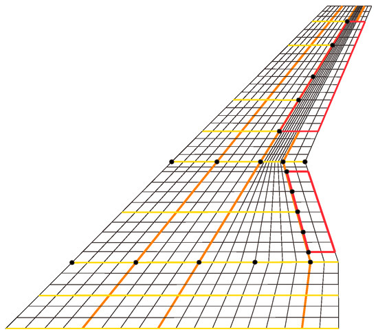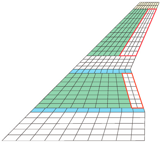 The DLM was used to generate aerodynamic elements for each wing surface and control surface, which were divided into a total of nine aerodynamic surfaces, as shown in Figure 4. The DLM involves dividing the lifting surface such as an aircraft wing into a series of aerodynamic panels or elements in the form of tetrahedrons with sides parallel to the incoming flow. It assumes that the aerodynamic force acting on each panel is concentrated at the intersection of the panel’s mid-chord line and its 1/4 chord line. The boundary conditions are satisfied at the intersection of the panel’s mid-chord line and its 3/4 chord line. By solving the governing equations, the unsteady aerodynamic force distribution on the aerodynamic panels can be determined. The DLM has become a preferred aerodynamic model for calculating the compressible unsteady aerodynamic forces in the subsonic range and is widely used in the design and analysis of aircraft. This method has been successfully integrated into the aeroelastic analysis module of finite element analysis software such as MSC.NASTRAN 2019.