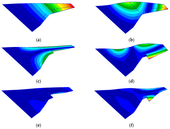 The first six vibration modes of the folding wing when the hinge stiffness between wing segments was 300 Nm/rad and the hinge stiffness of the control surface was 50 Nm/rad in the unfolded state: (a) the first-order mode; (b) the second-order mode; (c) the third-order mode; (d) the fourth-order mode; (e) the fifth-order mode; (f) the sixth-order mode.
