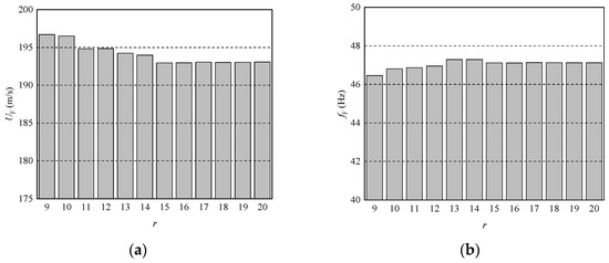 Variation in flutter speed and flutter frequency with modal truncation order r: (a) ; (b) .