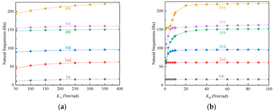Relationship between the first six natural frequencies and hinge stiffness. (a) Variation in the first six natural frequencies with hinge stiffness . (b) Variation in the first six natural frequencies with hinge stiffness .
