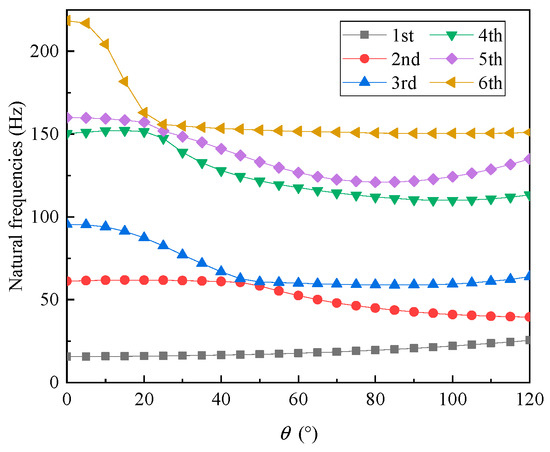 Next, we studied the effect of changes in the folding angle on the system’s natural frequencies. By keeping the outer-wing segment horizontal and performing modal analysis for the middle-wing segment with folding angles ranging from 0 to 120 degrees in increments of 5 degrees, we could derive the variation pattern of the system’s natural frequencies with respect to the folding angle, as shown in Figure 8.