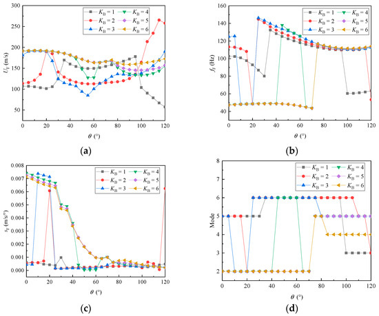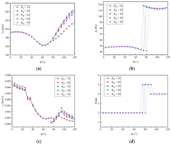 Certainly, we understand that variations in the hinge stiffness between wing segments can significantly impact the structural inherent properties, thereby altering the flutter characteristics of the modified Z-shaped folding wing. When varying the hinge stiffness , the responses such as flutter speed, flutter frequency, flutter slope, and flutter mode of the modified Z-shaped folding wing under different folding angles were calculated, as illustrated in Figure 11.