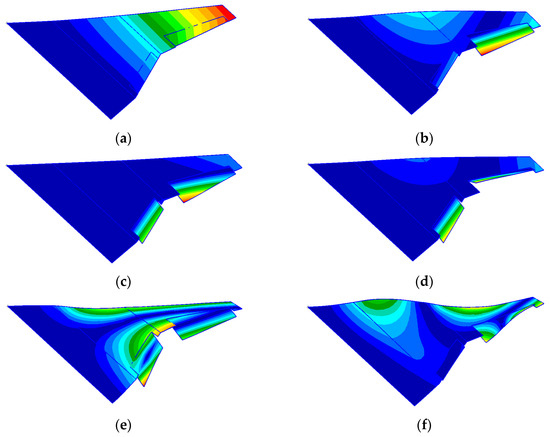 However, when the hinge stiffness of the control surface is designed to be too low, or when there is partial failure in the hinge of the control surface, the lower order modes of the system will manifest as local modes of the control surface. Taking KB of 1 Nm/rad as an example, the first six vibration modes of the unfolded folding wing were calculated and are shown in Figure 13.