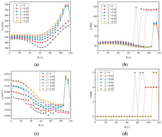 By introducing structural damping through the modal damping ratio in the aeroelastic system, allowing it to vary from 0 to 0.1, Figure 15 presents the variation curves of the flutter speed, flutter frequency, flutter slope, and flutter mode extracted after the flutter calculations. As seen in Figure 15a, compared to the undamped case, the aeroelastic system with modal damping ratios exhibited higher flutter speeds and smoother transition states. Around a folding angle of 110°, the flutter speed of the aeroelastic system with modal damping ratios reached a maximum value and converged as the modal damping ratio increased.