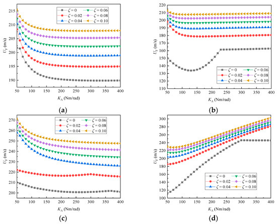 The variation in flutter speed with hinge stiffness and modal damping ratio under different folding angles: (a) ; (b) ; (c) ; (d) .