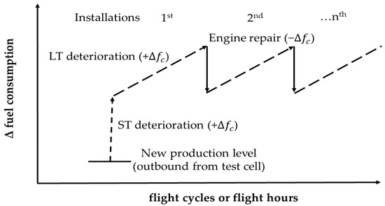 According to Wulf et al. [18], during its in-service operation, an aircraft engine experiences two types of deterioration, short and long term, as depicted in Figure 2. Short-term (ST) deterioration occurs during the first production flights performed by the airframer. This type of deterioration is characterized by causing a significant performance debit (e.g., an increase in and a decrease in ) during a relatively short period of time, as depicted by the steep slope in Figure 2. On the other hand, long-term (LT) deterioration occurs during regular revenue service flights; its performance debit is gradual over time. Turbomachinery degradation is caused by the normal wear of its internal components (blades, vanes, seals, and clearances) and thus does not include sudden deterioration effects such as those caused by foreign objects, the so-called FOD (foreign object damage).
