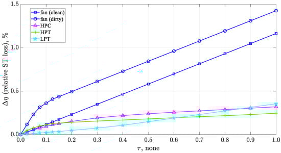 The LT efficiency deterioration for each turbomachinery component presented in [18] is shown in Figure 3 as a function of . The numbers presented in this figure should be understood as deviations from the ST efficiency loss curve and interpreted as efficiency losses, i.e., −1 × .