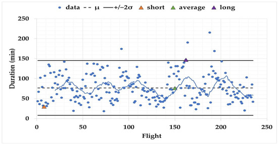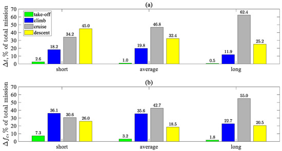 For the short-mission flight, the time was representative of the shortest duration flights from Figure 4 (15 flights were between 25 and 35 min). The average duration of the flights from this sampling is 1.3 h; however, the average missions considered in this paper lasted 1.4 h. The latter number is close enough to that reported in [28] (i.e., 1.6 h). Finally, the long-mission flights correspond to a +2σ flight (i.e., 2.5 h).