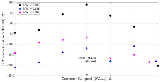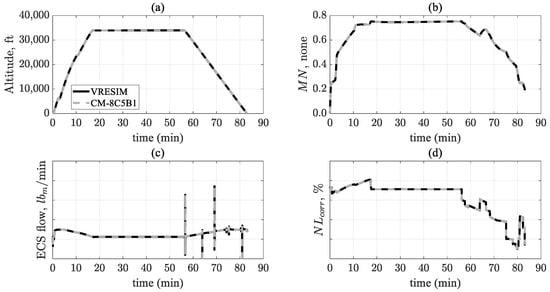 The assumptions concerning the cycle model are presented now. A group of parameters obtained from the VRESIM’s output data were input to the cycle model. These data include the altitude, Mach number (), ambient temperature deviation from standard atmosphere (), ECS bleed setting (flow and pressure), and corrected fan speed (). A validation of the input boundary conditions to the cycle model is presented in Figure 6 for the average-time mission. This validation ensured that the cycle model ran under the same conditions as the VRESIM real time model, thus avoiding the introduction of a potential input bias [43].