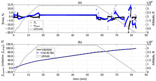 The data obtained from the VRESIM were then input to the CM-8C5B1. The flight conditions (altitude, , and ambient temperature deviation), power settings () and bleed settings for each data point in the missions were provided to the cycle model. The VRESIM and the CM-8C5B1 (for = 0.0) simulations correspond to a new engine condition (or zero deterioration). The during each flight phase and the so-called trip fuel (defined in Section 4.1) were compared between the VRESIM and the CM-8C5B1 to validate the results from the latter.