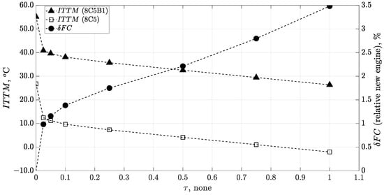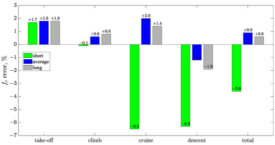The average engine deterioration of the CF34-8C5B1 was considered equivalent to that observed for the CF6-6D [18]; based on this premise, . The total can be interpreted as the linear combination of the individual (i) turbomachinery component contributions, as expressed in Equation (5).