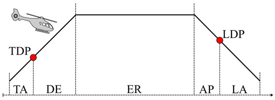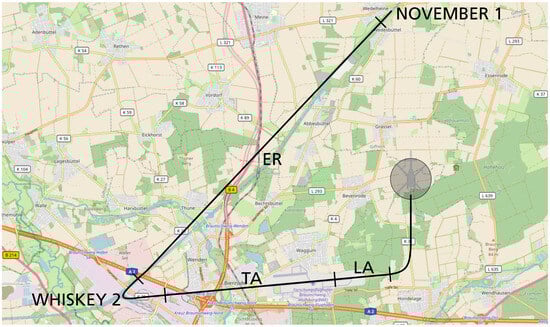 A simplified standard mission profile was developed, which is most representative for a typical helicopter flight. According to Figure 2, it was divided into Take-off (TA), Departure (DE), En-Route (ER), Approach (AP), and Landing (LA), which covers the most dangerous flight phases [1]. The transition point between TA and DE, respectively, AP and LA, was defined as Take-off-Decision-Point (TDP) and Landing-Decision-Point (LDP), which can be found in the flight manual [36,37]. Table 2 shows the definition of TDP and LDP for a normal procedure of a BO105 and an EC135. The flight phase ER can be abstracted as a stationary forward flight outside an obstacle-containing environment. A similar one applies for the flight phases DE and AP that can be described as stationary climb and descent outside an obstacle-containing environment. To transfer the selected mission profile into an experimental setup that is repeatable and feasible in a real-world environment and in the simulator, Figure 3 shows a top–down view of the flight path of the study at Braunschweig Airport (EDVE). The flight phases are labeled, and the flight phase ER is defined as the route between the control points WHISKEY 2 and NOVEMBER 1 on the way out of the control zone. The pilots’ flight task was to perform a Standard CAT A landing and take-off at runway 26. Afterwards, the pilots should climb until an ALT of about 1500 ft Above Sea Level (ASL) was reached and accelerate to a 100 kt Indicated Airspeed (IAS).