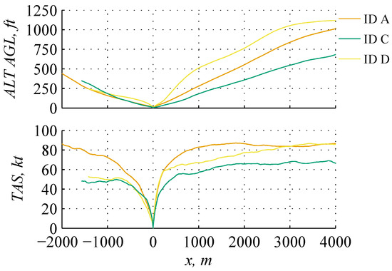 The pilots’ flight performance is described by the ALT AGL and the True Airspeed (TAS). Before the helicopter touches the ground, all flight paths lie on top of each other (see Figure 7). After take-off, the pilots chose different strategies, which is shown by the flight paths and the TAS. Pilot A decelerated and accelerated more in comparison with the other pilots.