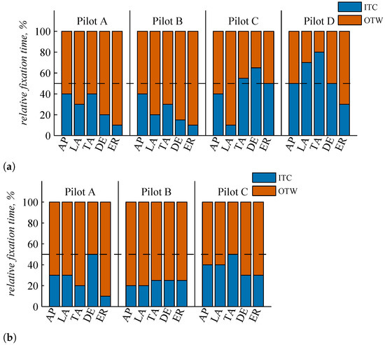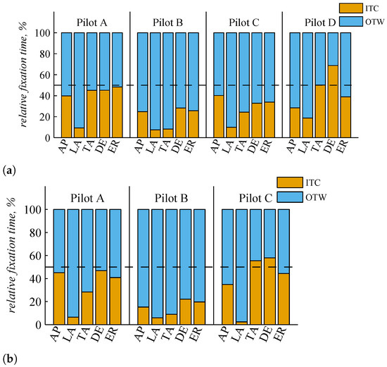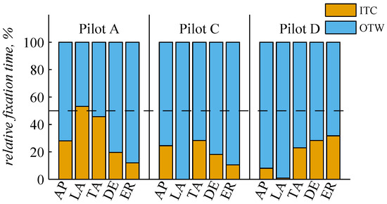 For a first assessment of the pilots’ gaze behavior, Figure 8 shows the distribution of the fixation time spent ITC or OTW for each pilot and each flight phase. The behavior of Pilots C and D is similar as they mainly looked OTW. Especially during LA, the fixation time OTW is below 2%. For all other flight phases, the relative fixation time ITC is about 20%. The behavior of Pilot A deviates for the flight phases LA and TA as the relative fixation time ITC is about 50%.