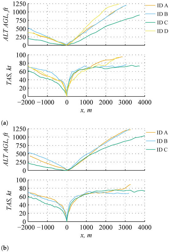 According to ALT AGL and TAS, Pilots A and B show a similar flight performance during fixed-based simulation. Pilot C’s flight performance deviated as the glide slope was flatter and the climbing gradient was smaller. Pilot D shows a comparable glide slope with Pilots A and B, but the climb rate is higher than that of the other pilots (see Figure 10a). The recorded flight test data during motion simulation were similar (see Figure 10b).