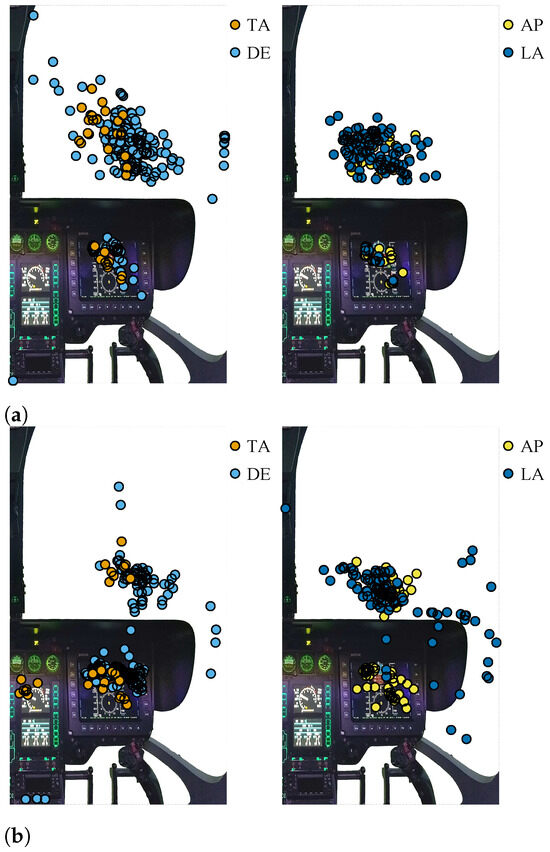 During the flight phases TA, DE, AP, and LA, all pilots made fixations inside or outside the right side of the cockpit. As shown in Figure 9, the pilots looked at the technical parameter of the helicopter, e.g., rotor RPM and torque only during the flight phases TA and DE. Pilots C and D show a similar behavior as they looked to the right of the glare shield or through the chin window during the flight phases AP and LA. Both pilots commented that they used skid marks at the runway to obtain sufficiently good visual references. Moreover, the fixations of both pilots showed accumulations at the PFD during nearly all flight phases except for LA. Pilot A’s fixation distribution deviates as he used some information of the PFD only during AP. In addition, he did not need the torque indicator or rotor RPM during TA and DE. It is remarkable that accumulations can be found that offered no specific information. All pilots mainly looked straight ahead OTW and focused the runway.