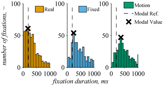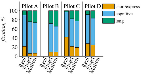 The fixation distribution of Pilot A according to the fixation duration of each fixation is shown in Figure 14. The fixations of all flight phases were combined to obtain enough fixation and were only separated according to the real flight or fixed and motion simulation. All distributions have a bin size of 60 ms and show a highly left-shifted distribution, as it was described by Galley et al. [25]. The modal value approximately corresponds to the reference value by [25]. In a further analysis, all fixations were classified into short/express (<150 ms), cognitive (150 ms ≤ t ≤ 900 ms), and long fixations (>900 ms) according to their duration (see Figure 15). The amount of short/express fixation was lower in the simulator than in the real flight, whereas the amount of long fixations increased from real flight to the simulator. The amount of cognitive fixation remained similar as well as the distributions between fixed and motion simulation.