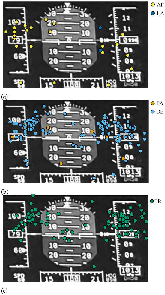 Hit maps of Pilot C during motion simulation: (a) hit maps during AP and LA, (b) hit maps during TA and DE, and (c) hit map during ER.