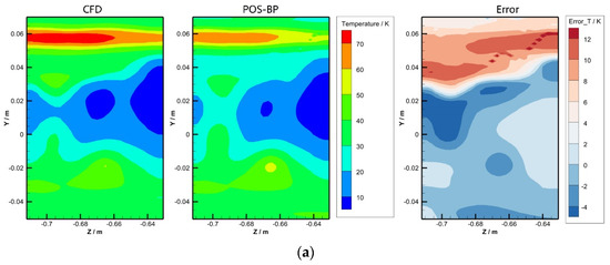 The first 10 orders of basis modes are used to fit the distribution of skin temperature and runback water thickness. The comparison of the POD fitting results with the CFD simulation results and the prediction errors for two of the training samples are shown in Figure 7 and Figure 8. It can be seen that the POD fitting results and CFD simulation results are in good agreement, and the POD fitting results can accurately extract the characteristics of the skin temperature distribution and the thickness distribution of runback water. Figure 7b also demonstrates the power of the POD method to predict the runback water distribution when there is no water film on the skin surface.