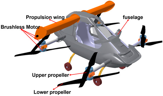 The eVTOL aircraft equipped with propulsive wings presents numerous advantages, including VTOL capability, high lift coefficients, improved flight efficiency, enhanced power performance, maneuverability, and reduced noise, and increased comfort for passengers. The details are as follows: (1) The propulsive wing features a substantial installation angle, resulting in a lift coefficient four to five times greater than that of a conventional wing at low airspeeds. With the same lift, the propulsive wing occupies less space, allowing for a more compact overall aircraft layout. (2) In forward flight, the propulsive wing predominantly generates lift, unloading eight propellers and feathering the lower propellers. This reduces aerodynamic interference between coaxial propellers and lowers propeller speed, thereby enhancing the flight efficiency [7]. (3) The propulsive wing contributes to the propulsion force, enhancing the cruising speed and acceleration of the eVTOL aircraft, significantly boosting the aircraft’s power performance. (4) In forward flight, the attitude of the eVTOL aircraft is controlled by four upper propellers, which have high maneuverability and good stability, reducing the number of horizontal and vertical tails and optimizing the aerodynamic layout of the eVTOL aircraft. (5) Coaxial propellers generate noise from unsteady interferences between the upper and lower propellers and aerodynamic effects. In contrast, the blades of the propulsive wing are located inside the wing, resulting in significantly reduced aerodynamic noise compared to conventional propellers [18]. By unloading the propellers through the propulsive wing, the aircraft’s noise is reduced, enhancing passenger comfort.