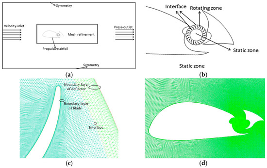 Figure 4 illustrates the computational domain, boundary conditions, and other settings for the simulations. In the forward flight (Figure 4a), the left side represents a uniform velocity inlet, the right side is a pressure outlet, and the top and bottom are symmetric boundaries. Since the analysis involves the rotation of the fan, sliding mesh technology is established for computation. The main airfoil and deflector adopt no-slip boundary conditions, the circular region inside the fan and the external flow fields are static zones, and the region around the blades is a rotating zone (Figure 4b), partitioned using unstructured meshes. The mesh at the propulsive wing is shown in Figure 4d. To accurately capture the details of the wing’s wake and enhance computational accuracy, the mesh near the airfoil is refined.